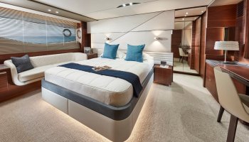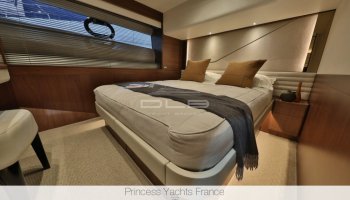 Le flybridge et son large sofa permettra de profiter de la brise dans l’après-midi. Les jouets de bord indispensables au mouillage se rangeront dans le grand garage à annexe (4,45 M de long) ou sur la plateforme de bain immergeable. La cuisine équipée et son vaste meuble bar à l’entrée du salon intérieur est idéalement orientée vers le cockpit. La timonerie dispose d’un poste de pilotage au design moderne et d’un accès direct au passavant tribord. Un grand toit ouvrant vitré surplombe le grand sofa en U du salon. De nombreuses essences de bois disponibles permettent au propriétaire de personnaliser son Princess et de créer ainsi son propre style. Ses 4 cabines disposent chacune de leur propre salle de bain attenante.