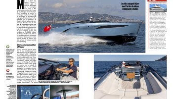 Le niveau élevé de technologie embarquée se retrouve également au niveau du tableau de bord. Pourvu du système Glass Cockpit de Garmin, ses deux écrans de 17 pouces permettent, outre les fonctions traditionnelles, d’afficher une vue virtuelle des deux foils et de leur position instantanée. L’aspect ludique n’a pas été oublié, avec un environnementgraphique qui évolue en fonction du mode choisi, Confort ou Sport. Le premier est adapté à une navigation jusqu’à 30 nœuds, tandis que le second permet d’accélérer automatiquement le mouvement des foils pour celles à haut régime.