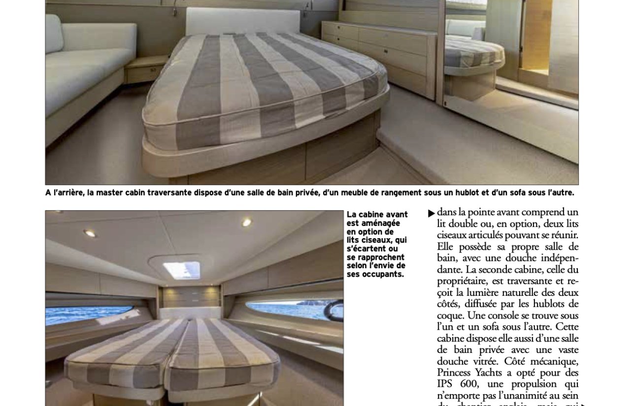 Cet espace commun, plus protégé que le hard-top, étonne par sa luminosité que l’on doit à plusieurs facteurs, dont les hublots de coque, mais aussi à la large descente qui se trouve à l’aplomb du pare-brise. Cette luminosité naturelle est amplifiée par un capot fumé fixe devant cette dernière. Le choix des teintes sur le modèle essayé compte également puisque les selleries blanches, la moquette et les menuiseries en chêne clair y participent. Dans sa version standard, la V50 propose deux cabines et deux salles de bain. Celle situéedans la pointe avant comprend un lit double ou, en option, deux lits ciseaux articulés pouvant se réunir. Elle possède sa propre salle de bain, avec une douche indépendante. La seconde cabine, celle du propriétaire, est traversante et reçoit la lumière naturelle des deux côtés, diffusée par les hublots de coque. Une console se trouve sous l’un et un sofa sous l’autre. Cette cabine dispose elle aussi d’une salle de bain privée avec une vaste douche vitrée. Côté mécanique, Princess Yachts a opté pour des IPS 600, une propulsion qui n’emporte pas l’unanimité au sein du chantier anglais, mais qui