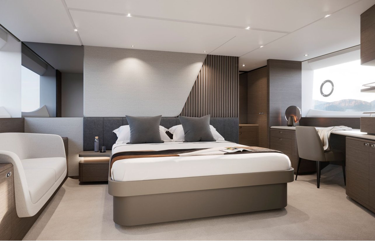 Every detail has been carefully crafted by the Princess Design Studio: custom furniture, hand-stitched leather, elegant wall coverings, and refined V-Groove Walnut flooring. With four timber options and customizable finishes, the S74 allows a truly unique interior tailored to your style. The full-beam owner’s suite, outdoor spaces, and high-end amenities make every moment on board a supreme luxury experience.