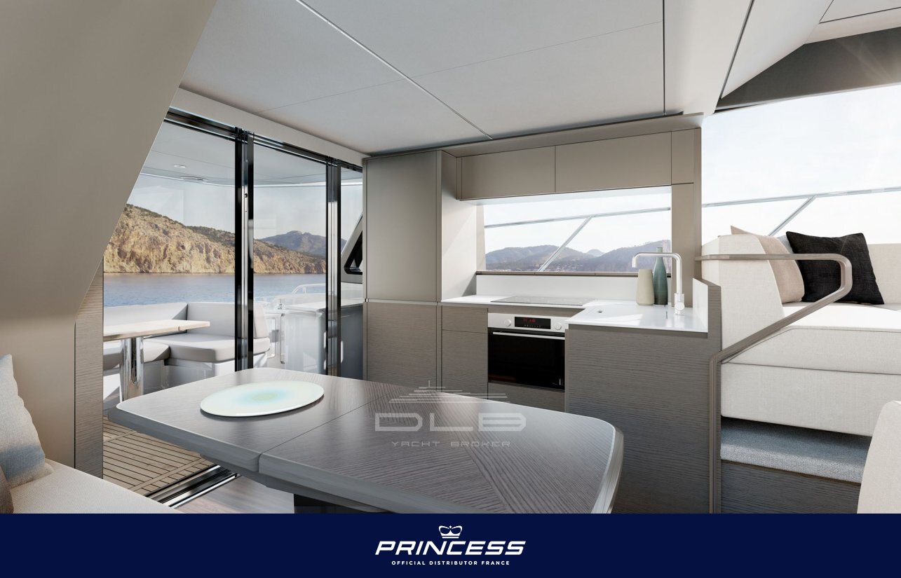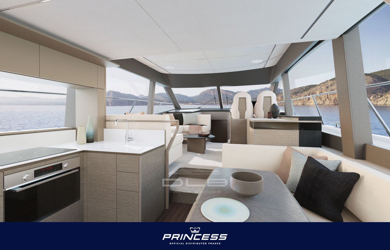 Inside, the main deck layout has been carefully designed with a highly functional configuration, including a generous saloon and a dinette positioned opposite the galley, enhancing conviviality and ensuring smooth circulation on board. The galley, located aft with direct access to the cockpit, allows for practical day-to-day use and seamless connection between interior and exterior spaces.