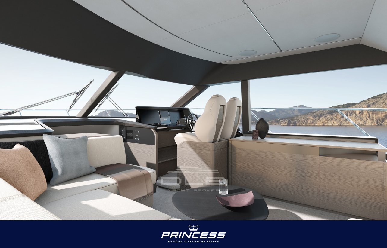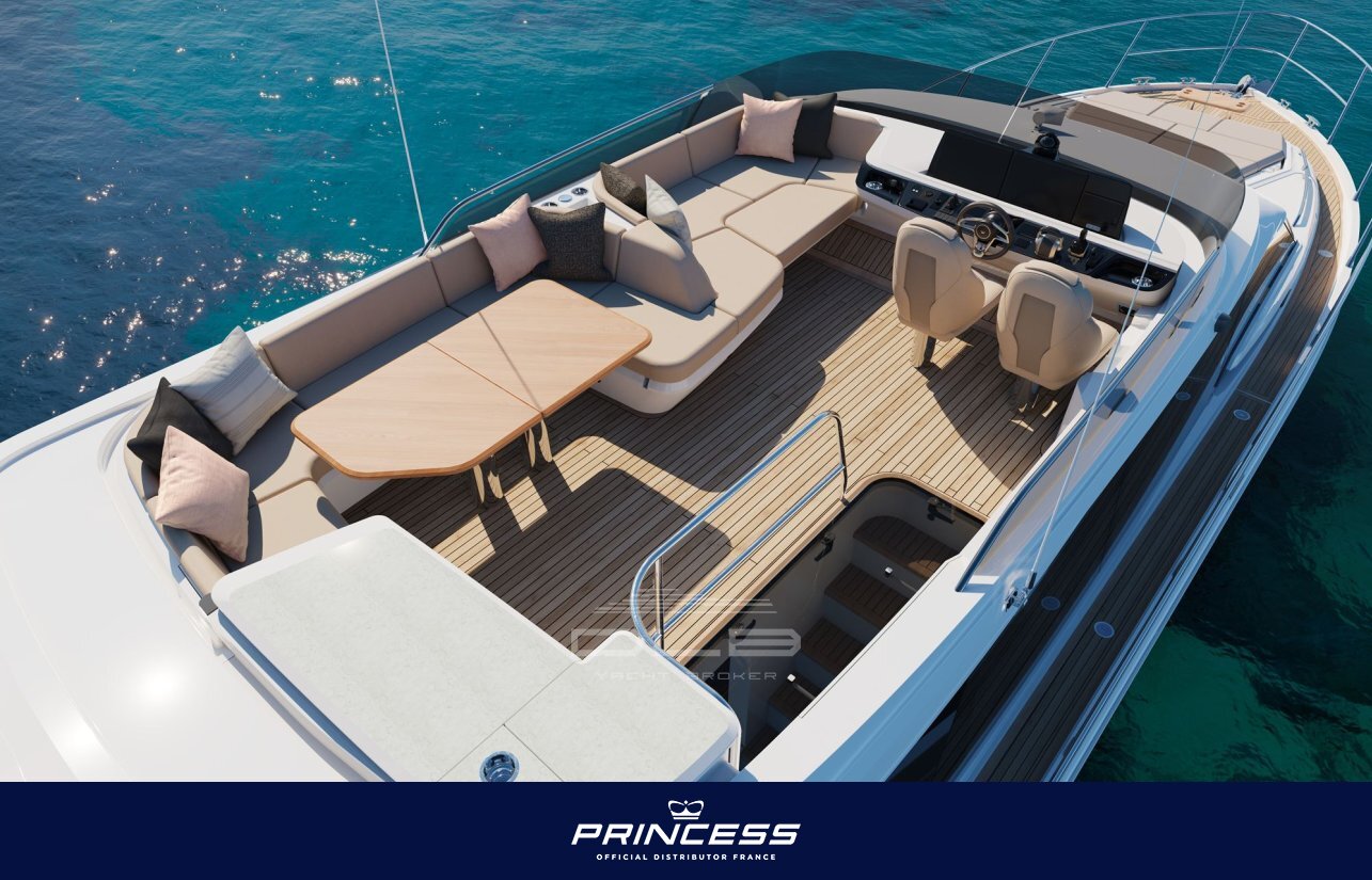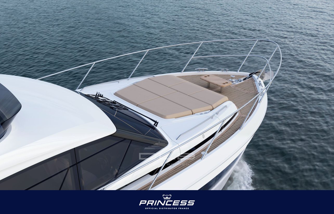 In terms of performance, the Princess F54 is powered by Volvo Penta D13 engines, allowing her to reach speeds of over 30 knots while maintaining excellent comfort at sea. The boat can also be equipped with a gyroscopic stabilizer and bow and stern thrusters for easy manoeuvring.