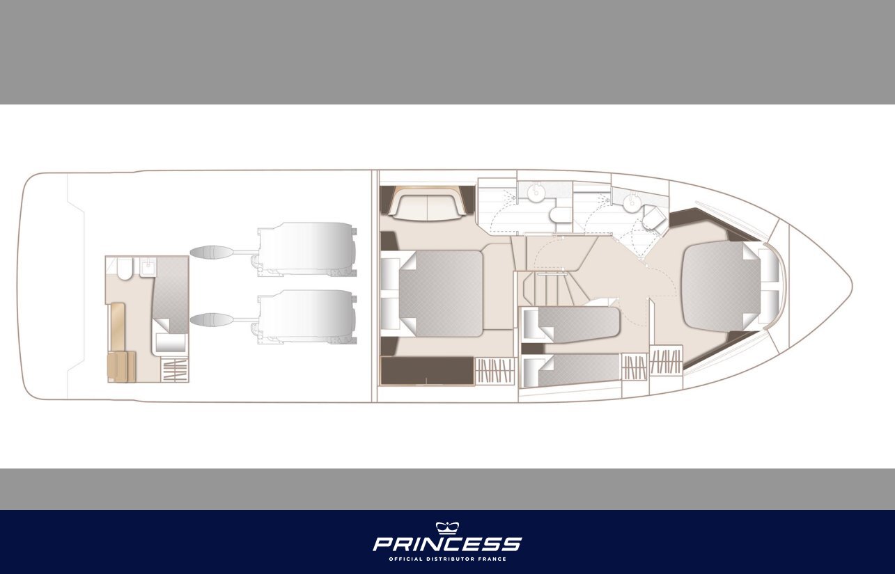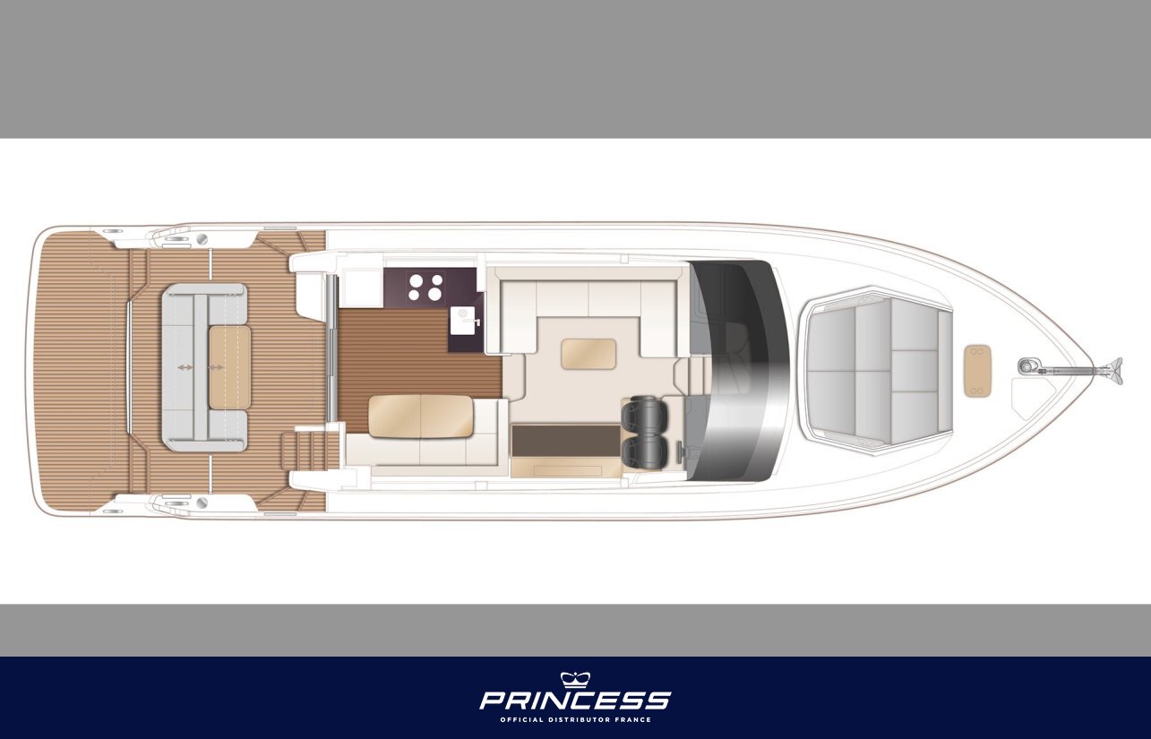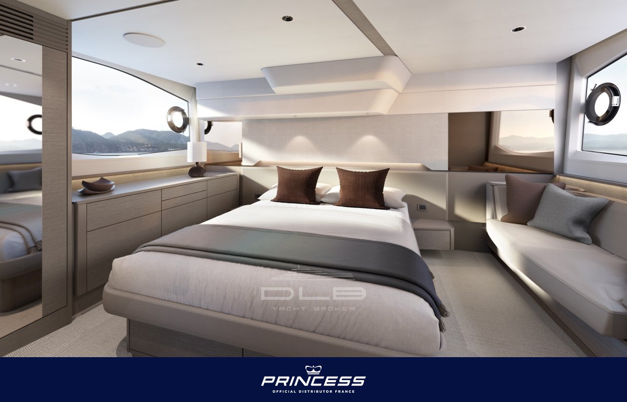 In terms of performance, the Princess F54 is powered by Volvo Penta D13 engines, allowing her to reach speeds of over 30 knots while maintaining excellent comfort at sea. The boat can also be equipped with a gyroscopic stabilizer and bow and stern thrusters for easy manoeuvring.