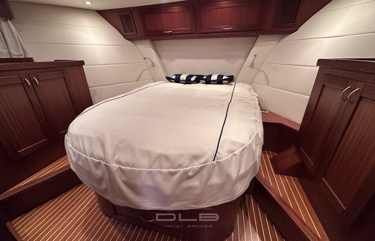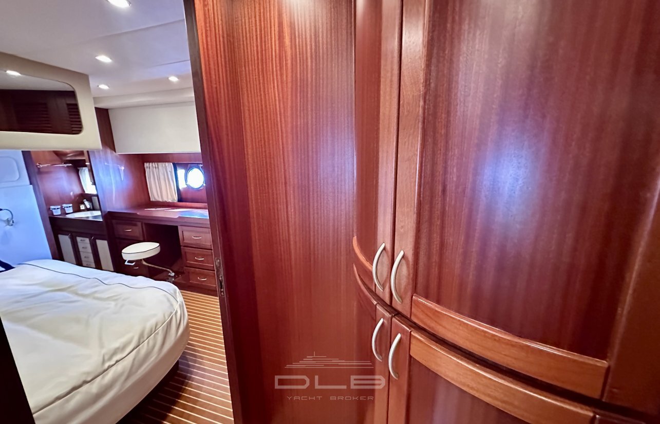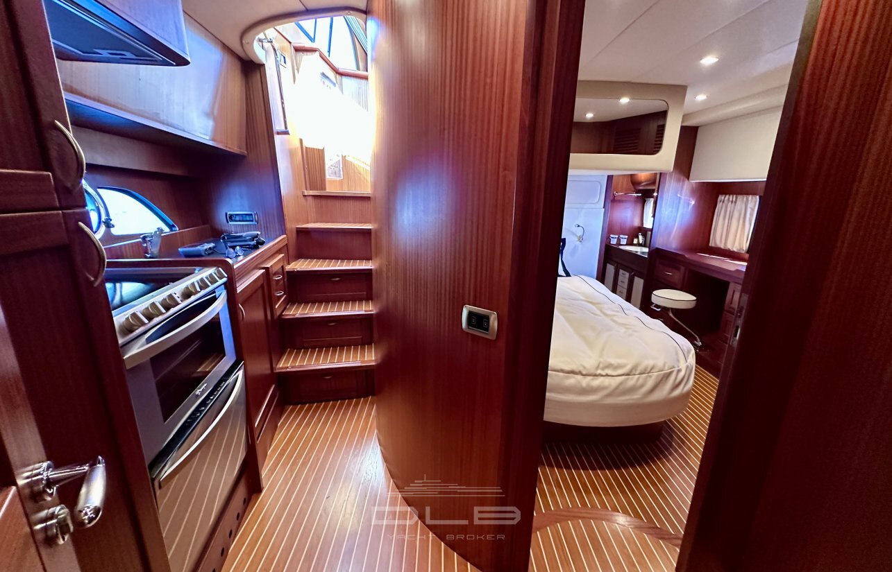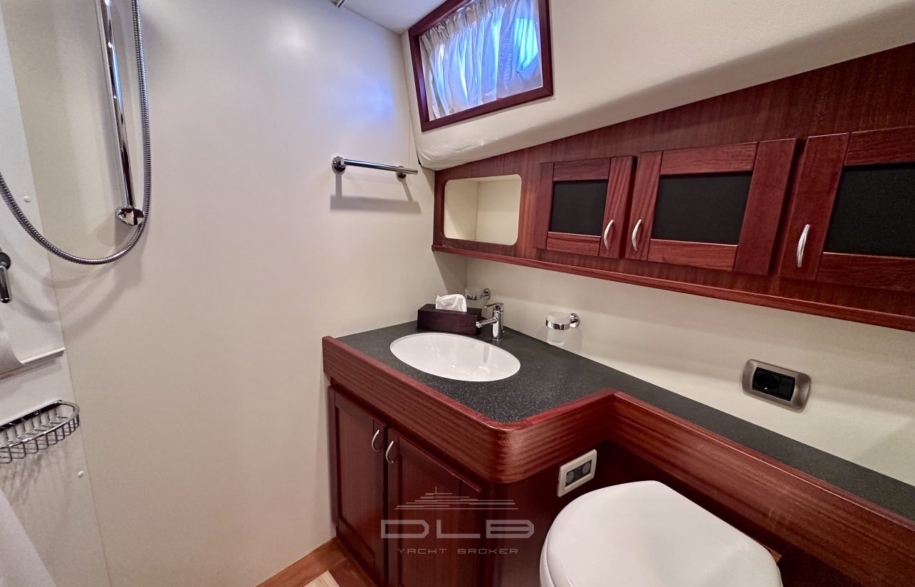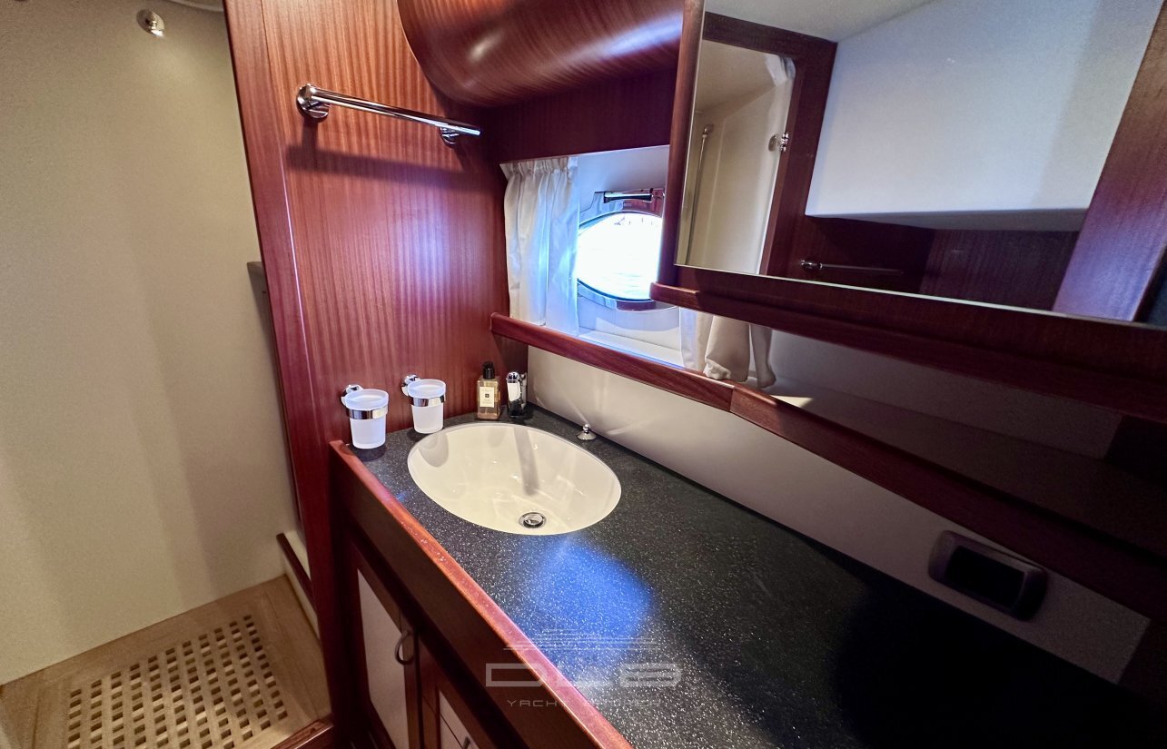 This model stands out with its two spacious cabins and two bathrooms, complemented by a crew cabin with private bathroom, unusually large for a yacht of this size.