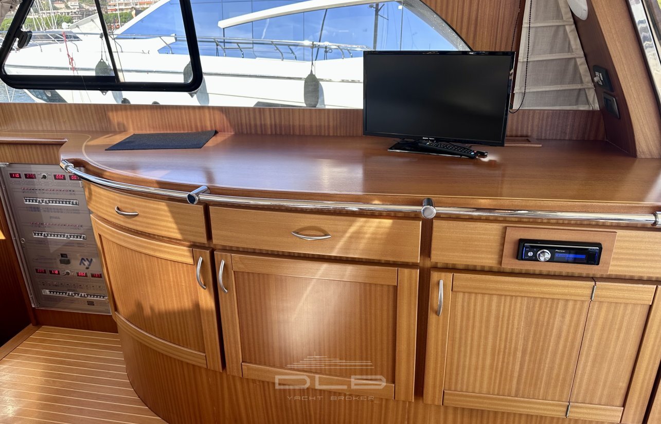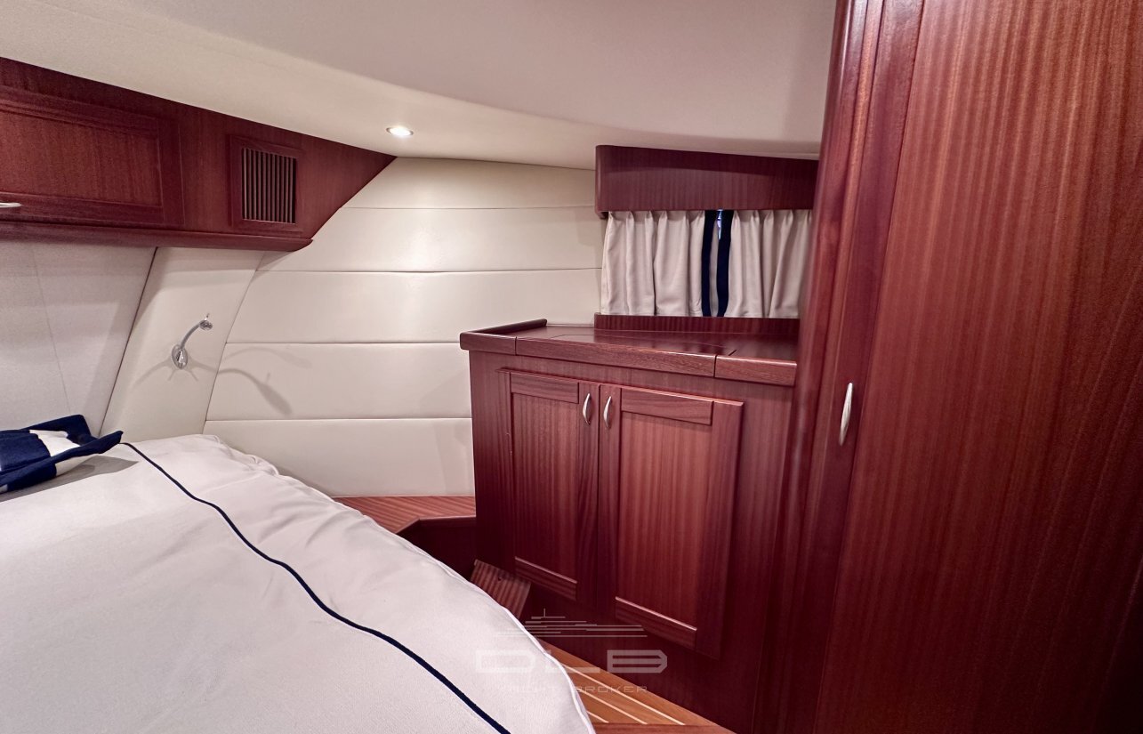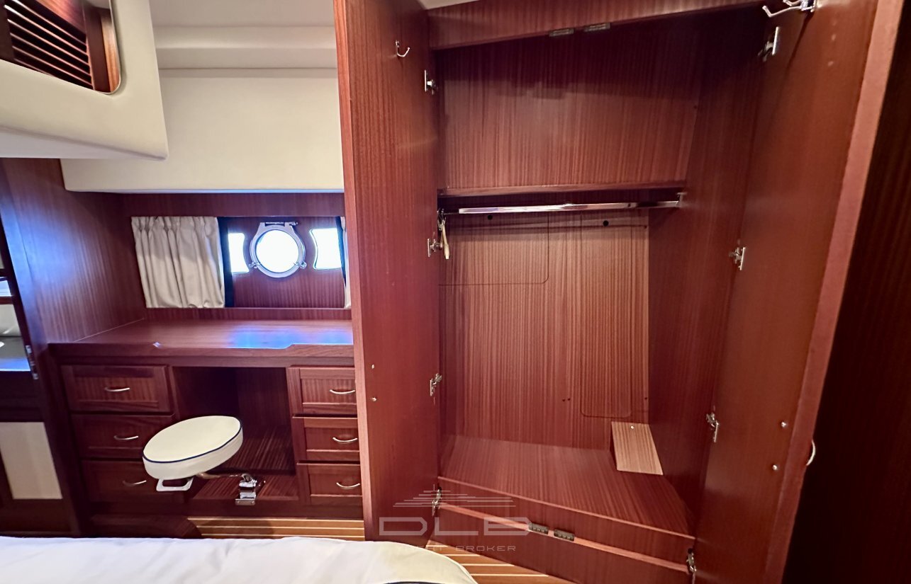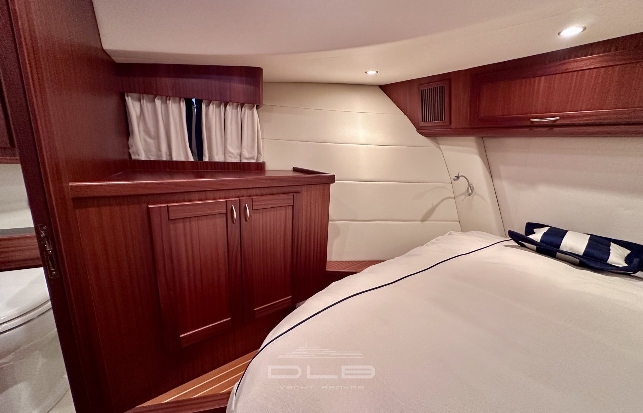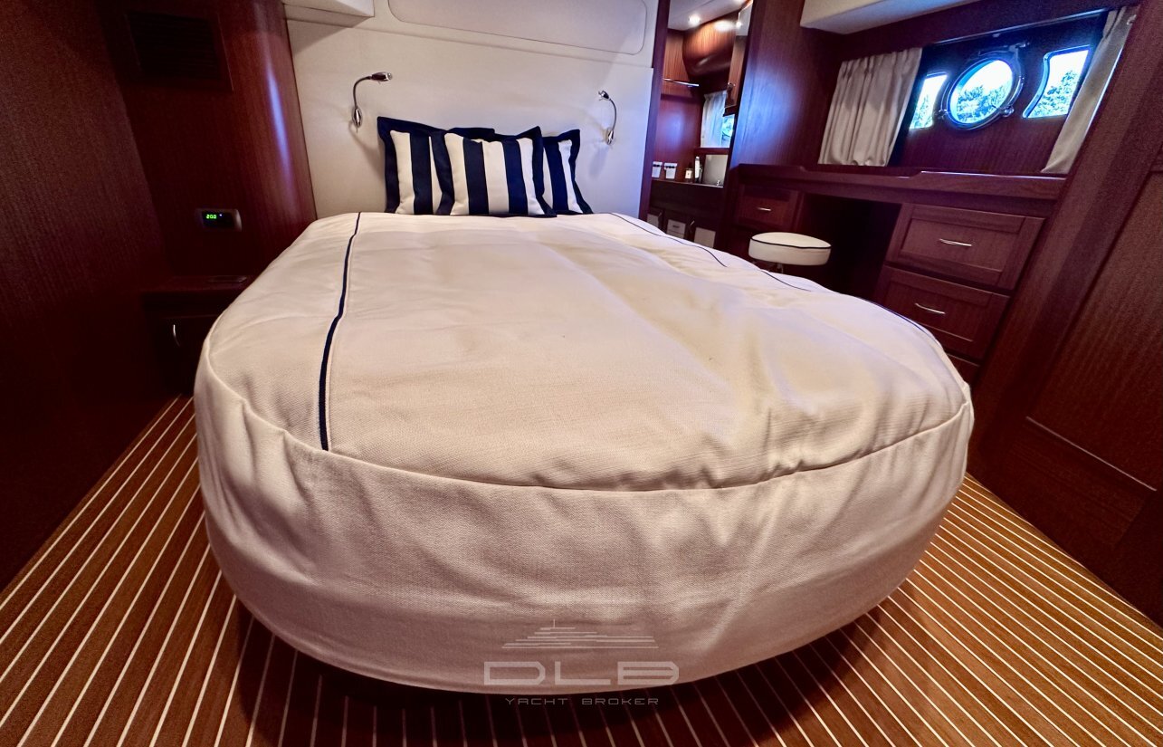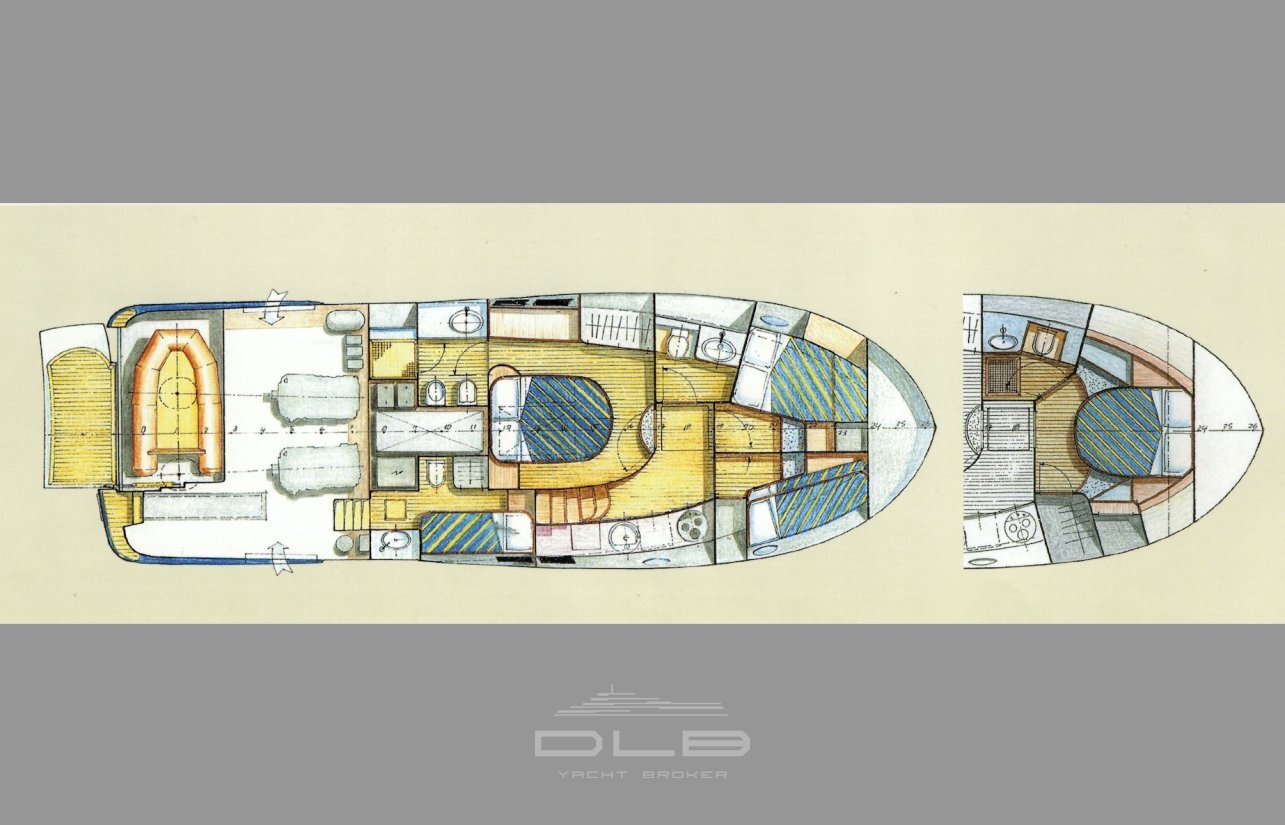 This model stands out with its two spacious cabins and two bathrooms, complemented by a crew cabin with private bathroom, unusually large for a yacht of this size.