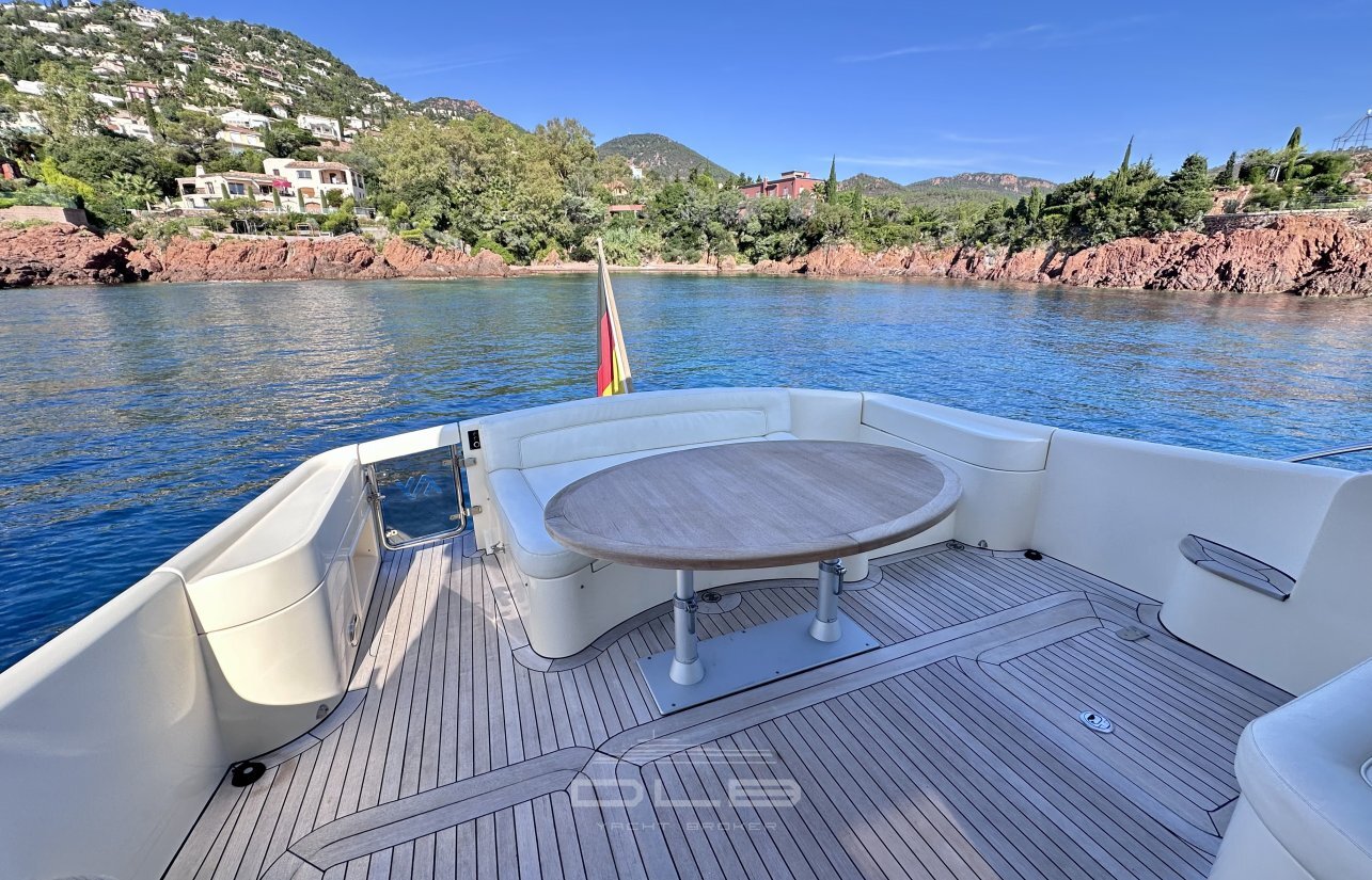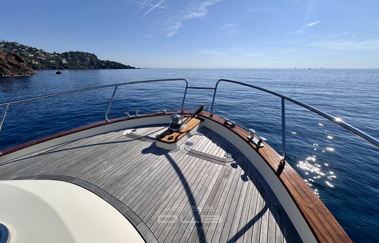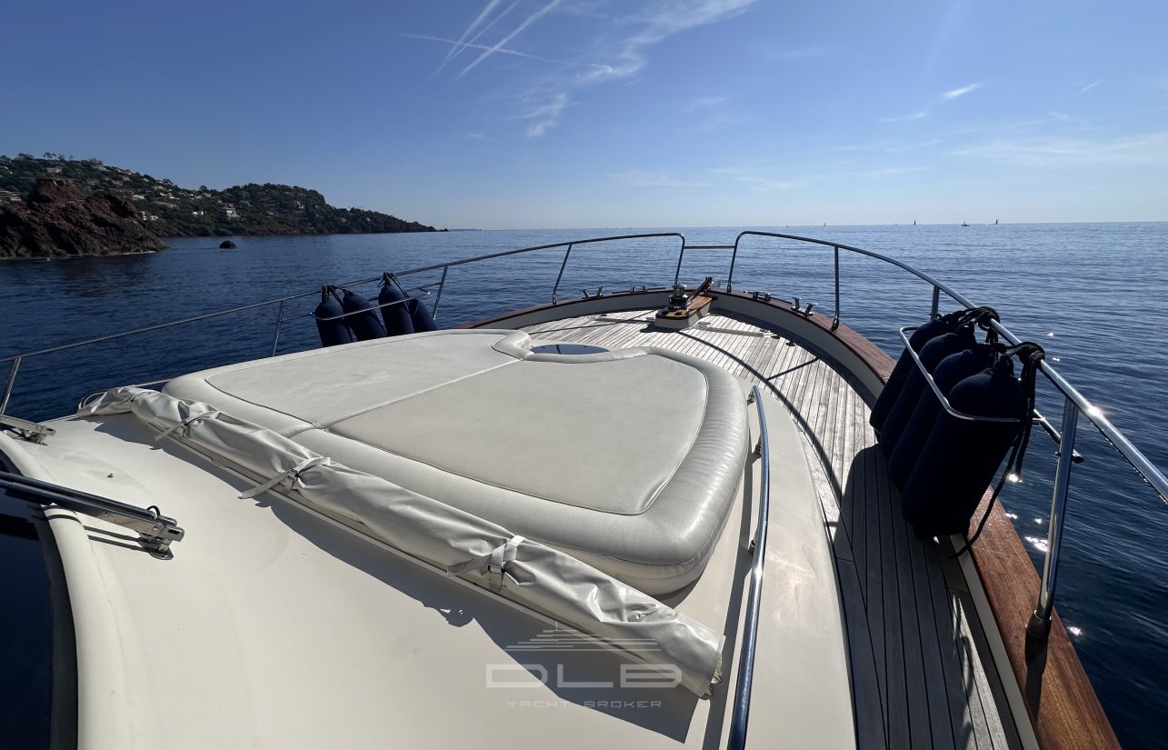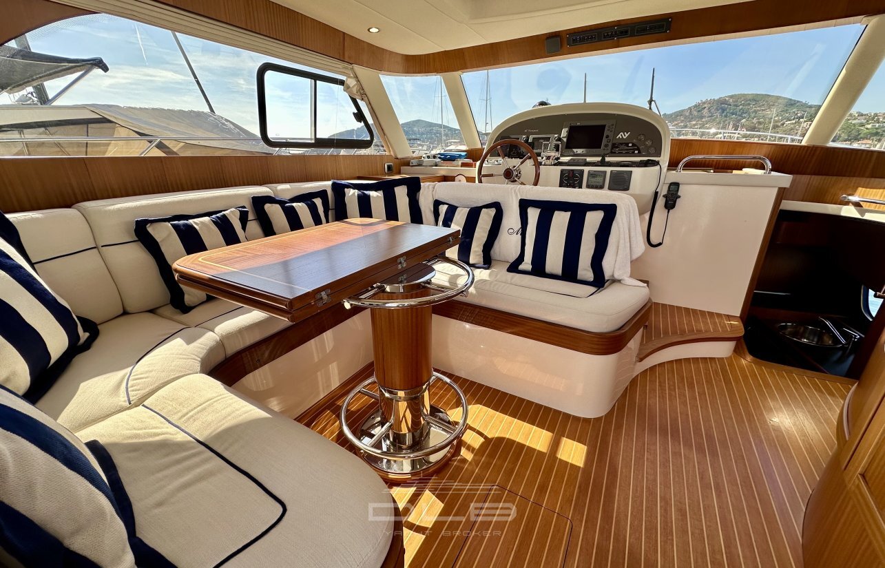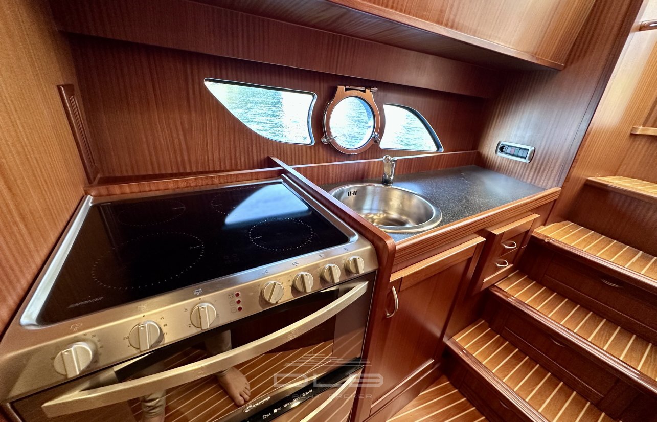 This model stands out with its two spacious cabins and two bathrooms, complemented by a crew cabin with private bathroom, unusually large for a yacht of this size.