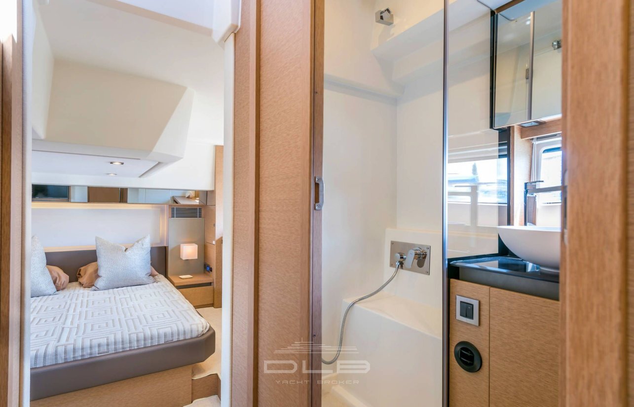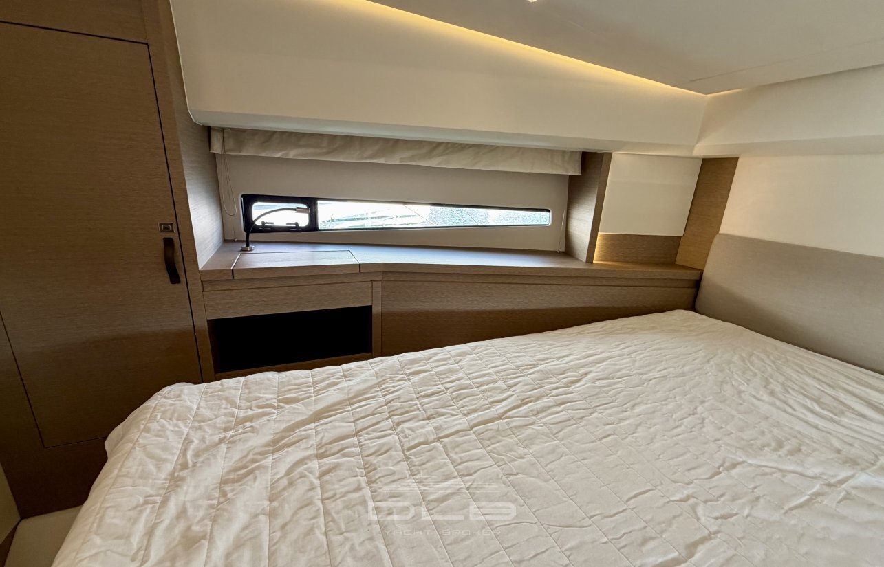 The full-beam central owner’s cabin offers generous volume, excellent privacy and a high level of comfort, complemented by a guest cabin and additional berths thanks to the convertible saloon.