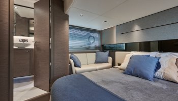 Inside, innovation and flexibility are the keywords. The lower deck salon is a spacious and elegant reception area. The owner's cabin is a true haven of peace, occupying the entire width of this Princess.