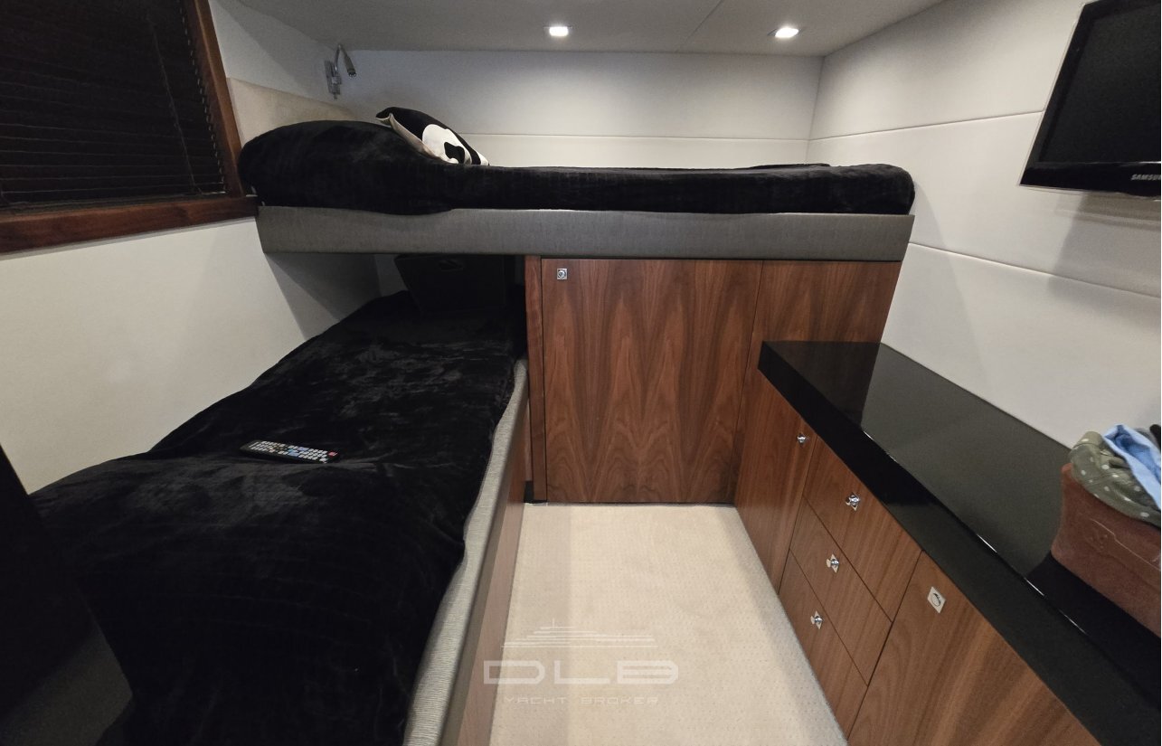 On board, enjoy three luxurious cabins, two bathrooms, a bright saloon with sunroof, as well as a large hydraulic platform and a telescopic gangway. Designed for comfort and conviviality, it is equipped with everything you need: bow and stern thrusters, watermaker, satellite TV, full appliances, ice maker, and high-end Raymarine electronics.
