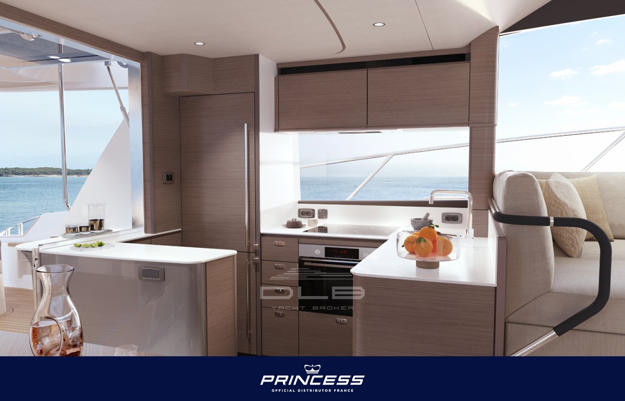 Ce yacht exceptionnel incarne l'élégance, l'innovation avec des performances impressionnantes ; équipé de moteurs MAN V8-1000 ou MAN V8-1200, le Princess F58 peut atteindre des vitesses allant jusqu'à 34 nœuds. Les espaces extérieurs sont conçus pour la convivialité et la détente. Le vaste flybridge, avec son grand coin repas et son bar équipé d’un barbecue électrique, est l’endroit idéal pour se détendre. La barre centrale offre une visibilité panoramique et les sièges convertibles en bains de soleil permettent de profiter pleinement du soleil. La terrasse avant offre deux bains de soleil avec des options de rangement et des appuis-tête réglables, créant un espace modulable parfait pour se relaxer ou recevoir des invités. Le cockpit spacieux se relie parfaitement au salon et à la cuisine, formant un espace de vie agréable. Il mène également à la plateforme de bain où se trouve aussi en options du rangement et un barbecue au bord de l'eau. L’intérieur offre un design soigné et intemporel. Le salon lumineux grâce aux fenêtres panoramiques est équipé d'un canapé en U et d'une table convertible en table à manger, créant un espace parfait pour des moments en famille ou entre amis. Le pont inférieur dispose de trois belles cabines, dont une cabine VIP à l’avant, une cabine à deux lits jumeaux convertibles et une cabine propriétaire avec un dressing. Une cabine d’équipage optionnelle complète le tout. Le Princess F58 redéfinit les standards de luxe avec des lignes épurées et des détails raffinés.