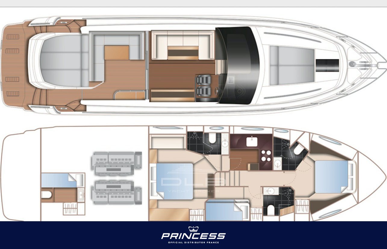Côté aménagements, le Princess V57 propose une configuration rare avec 3 cabines et 3 toilettes/douches, garantissant intimité et confort lors des croisières. Les cabines, aménagées avec goût, comprennent deux cabines avec grands lits doubles et une cabine avec lits superposés.