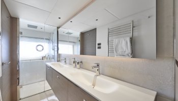 Chaque détail de ce yacht a été soigneusement pensé pour offrir une ambiance élégante et chaleureuse. Le choix des tissus et des coloris a été réalisé avec une attention particulière, créant un cadre où le luxe rencontre le confort.